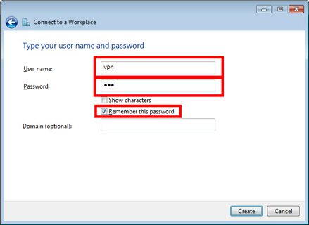 If the username and password prompting screen appears, input "vpn" (3-letters) on both username and password field. You should check "Remember this password" .