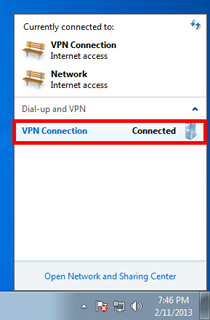 To start a VPN connection by using the VPN connection setting, click the network icon on right-bottom side of Windows. The VPN settings will be listed on the screen. Click a VPN setting which you want to use. If VPN connection will be established, the "Connected" status will be displayed.