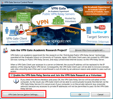 The "VPN Gate Service Control Panel" will appear. Check the "Enable the VPN Gate Relay Service and Join the VPN Gate Research as a Volunteer" checkbox. After that, click the "VPN Gate Service Option Settings" button.